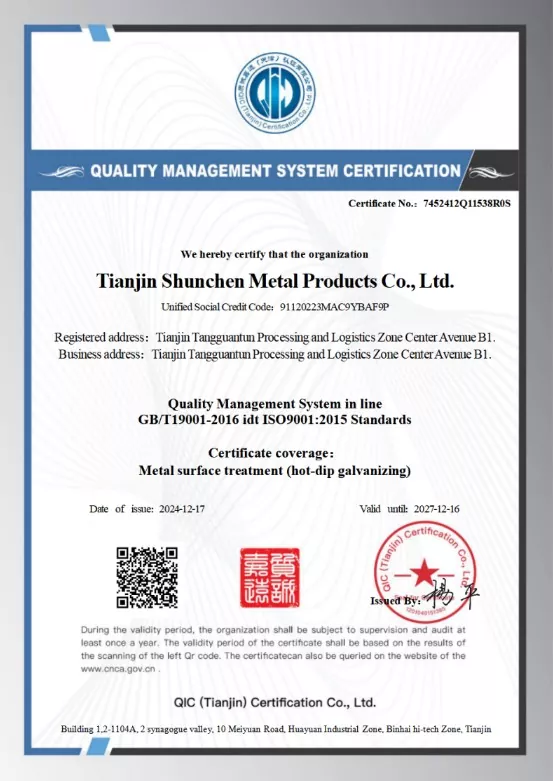 Piliin ang Shunchen para sa maaasahang kalidad. Gumagamit kami ng mataas na kalidad na bakal ng Q235B o Q355B, na pinoproseso sa pamamagitan ng hot-dip galvanizing para sa corrosion resistance. Ang temperatura ng sink pot ay tiyak na kinokontrol sa loob ng hanay ng 450-460 degrees Celsius upang matiyak ang malakas na pagdirikit ng zinc coating at walang napalampas na mga lugar. Ang aming mga produkto ay sumusunod sa ISO9001 na sertipikasyon ng sistema ng kalidad at sinusuportahan ng mga ulat ng inspeksyon ng zinc coating ng third-party.